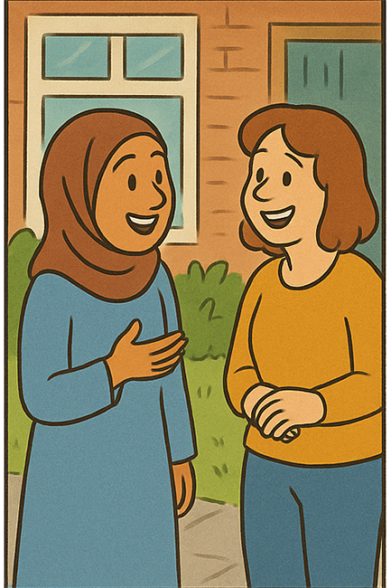 Laat haar een kort dialoogje schrijven of inspreken over een burensituatie (bijv. via WhatsApp-bericht of voice note in de klas). Dit versterkt ook de actieve productie